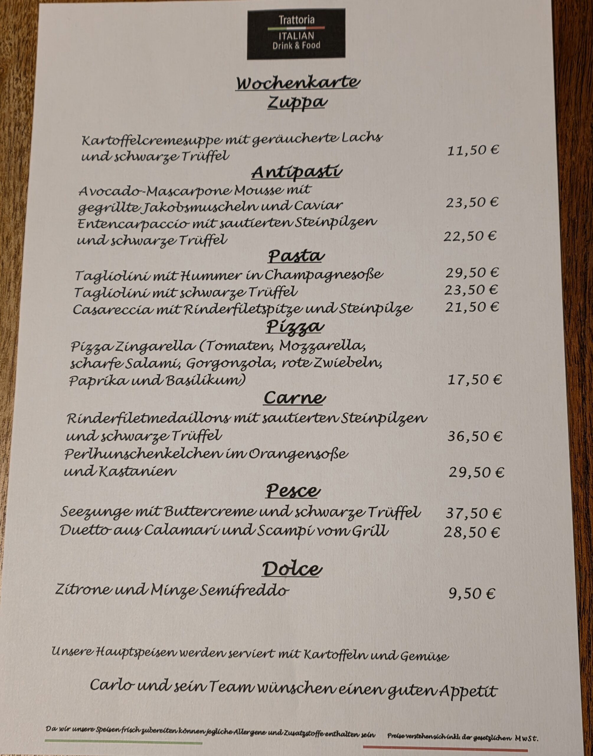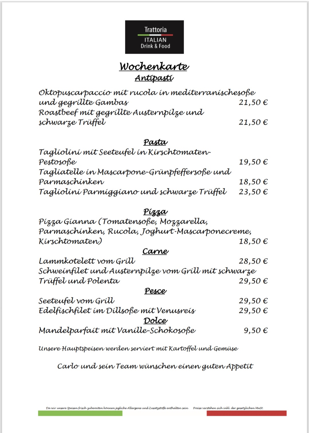 Willkommen auf unserer Seite mit den Speisekarten! Hier finden Sie alles, was Sie brauchen, um Ihre kulinarischen Wünsche zu erfüllen. Wir haben unsere Standard-Speisekarte, auf der Sie unsere köstlichen Gerichte und Desserts finden. Aber das ist noch nicht alles – wir bieten auch eine wöchentlich wechselnde Speisekarte mit saisonalen Spezialitäten an. Und wenn Sie auf der Suche nach dem perfekten Wein zu Ihrem Essen sind, werfen Sie einen Blick auf unsere umfangreiche Weinkarte. Bei uns finden Sie für jeden Anlass das passende Essen und den passenden Wein. Schauen Sie sich unsere Speisekarten an und lassen Sie sich inspirieren!